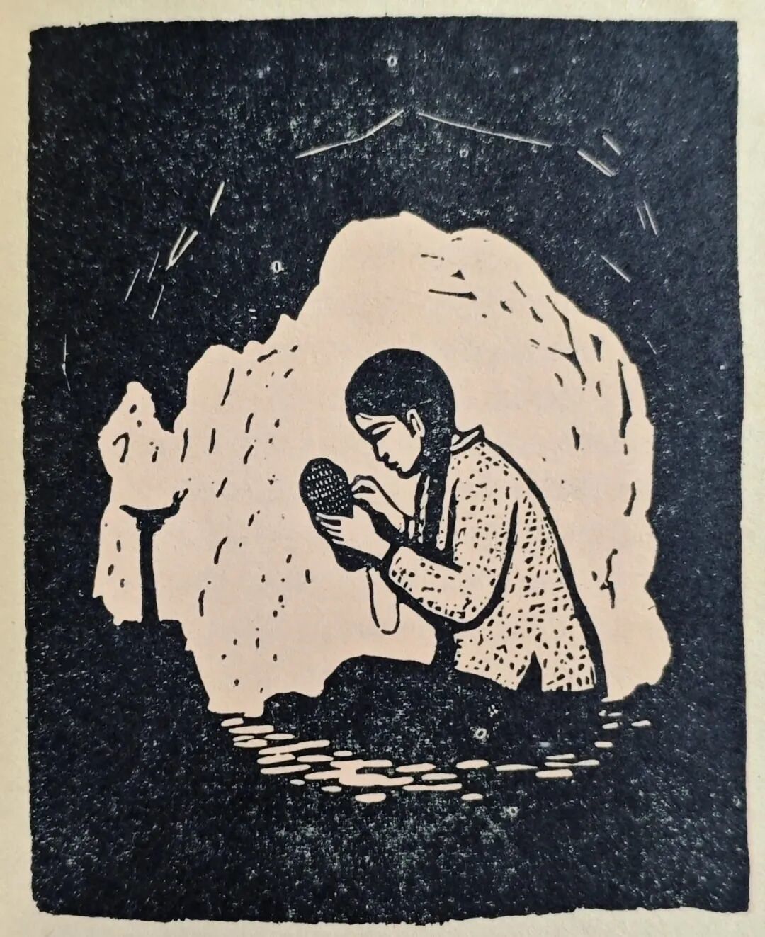 在凶险叙事中捕捉温情,是古元创作中一贯的自觉。《灵泉洞》里的小兰,赵树理笔下是备短矛以卫身的烈女子、革命者,在古元刻刀下,是洞窟中就着微光做针线的娴静女子。画面以大块浓黑铺陈洞窟的幽暗逼仄,仅留一方留白框出她的身形。侧身近光,双手捏针引线,衣衫的点状纹理、指尖绕动的线绳,皆刻得纤毫可见。洞底不规则的泛光小圆,是用黑白块面摹画的水泽,乃以烘托石穴的冷硬,并与暖软针线构成鲜明对照,映衬人物性格。他舍却写实光影的拘囿,取陕北民间窗花的黑白意趣,既合群众审美,又暗合“光”和“清冷”意象。